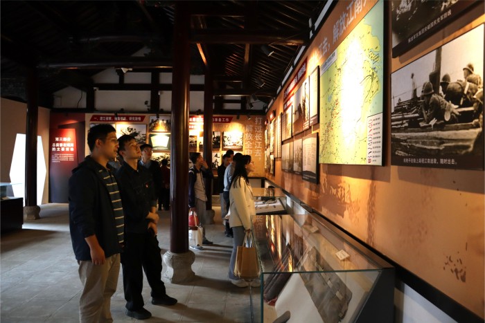 在渡江战役总前委旧址,全体党员依次参观了总前委参谋处旧址、《渡江颂》书画展厅、中共中央华东局旧址,观看了渡江战役总前委旧址的宣传纪录片,并在党旗前庄严宣誓,重温入党誓词。大家在一张张旧照片、一幅幅旧书画前驻足观看,缅怀先烈的英雄事迹。大家纷纷表示,要继承发扬革命先辈不畏艰险、勇于献身的革命精神,发挥好党员的先锋示范作用,用自身实际行动助推医工融合,为党和国家的医学事业发展添砖加瓦。