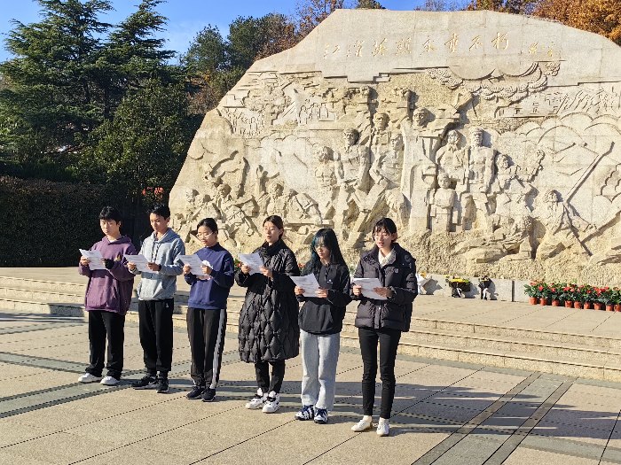 铭记历史是为了更好地珍惜来之不易的和平生活。在烈士陵园江淮英雄纪念碑前,同学们排队敬献鲜花、鞠躬凭吊先烈,并集体朗诵诗歌《英雄祭》,表达对革命烈士的敬仰和怀念之情。