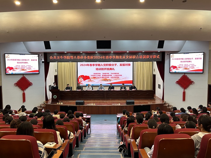 4月17日晚,公共卫生学院、基础医学院、口腔医学院、卫生管理学院、马克思主义学院、巢湖临床医学院、人文医学学院、精神卫生与心理科学学院等八所学院,在图书馆第一学术报告厅联合举办2024年春季学期入党积极分子、发展对象培训班开班典礼。