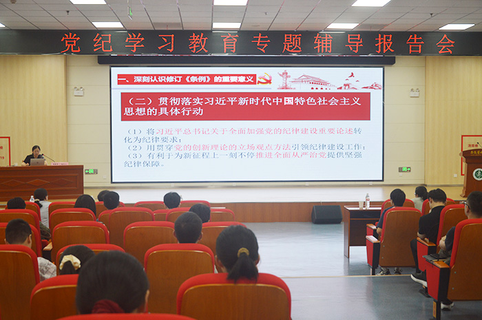 黄新美以学习贯彻《中国共产党纪律处分条例》为题,从深刻认识《条例》修订的重要意义、准确理解《条例》修订的主要内容、学校纪检监察工作实践和认真抓好《条例》贯彻执行四个方面,对如何学习贯彻好《条例》提出具体意见。她详细解读了《条例》中关于“六大纪律”新修订的内容细节,并从学校纪检监察工作实践出发,以重点领域典型案例为切入点进行了深刻剖析。