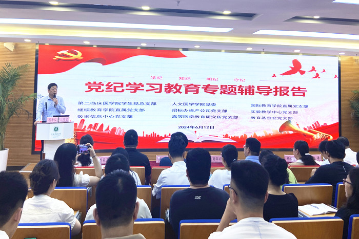 6月12日下午,第二临床医学院学生党总支、国际教育学院、人文医学学院、继续教育学院、招投标管理办公室、实验教学中心、高等医学教育研究所、资产经营公司、教育基金会、数据信息中心等十个单位,联合举办党纪学习教育专题辅导报告会。继续教育学院直属党支部书记、院长刘从云,实验教学中心党支部书记、主任沈涛主持报告会。省纪委监委第四纪检监察室副主任、一级调研员江帮富受邀作专题辅导报告。