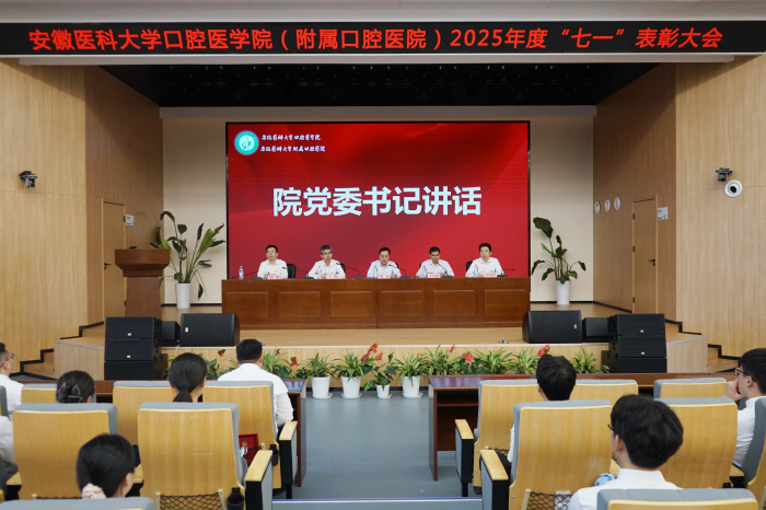 6月26日下午,口腔医学院(附属口腔医院)在高新院区18楼学术报告厅召开2025年度“七一”表彰大会。该院党委书记刘颀出席会议并讲话,院长王元银主持,院领导班子成员出席。