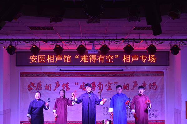 一袭蓝色长袍,一段双口相声,一端长桌前的两名同学还在抖着包袱,台下的观众已经笑成一团。这是上周末在青年之家举办的 “难得有空” 安医相声馆的现场。
