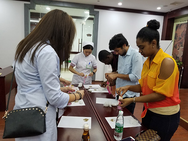 在新安中医馆,中药师首先向同学们介绍了端午节和中医香囊的关系,这些来自摩洛哥、南非、牙买加、印度尼西亚、印度等国的留学生们纷纷拿起药材闻闻味道,有的用手机拍照记录下这些中药的形貌和功效。在香囊制作过程中,国际学生们在中药师的示范下,都兴致勃勃地完成了自己的作品。