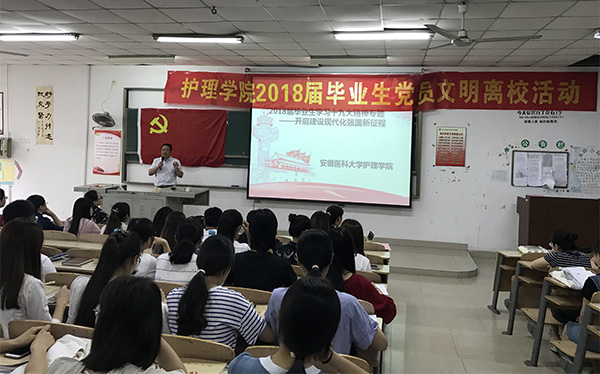 6 月 20 日,护理学院在南区 3102 教室举行 “新党员入党宣誓及毕业生党员文明离校倡议” 活动,党委书记赵云峰作 “学习十九大报告精神” 的专题讲座,各党支部书记、学生辅导员和全体本科生党员参加了活动。