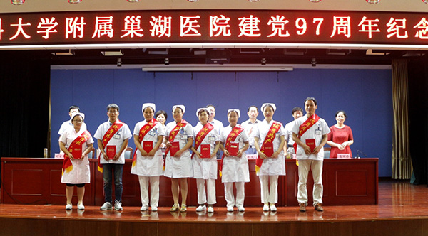 6 月 27 日下午,附属巢湖医院在综合服务楼学术报告厅召开建党 97 周年纪念暨表彰大会,院领导刘全礼、孙会芹、夏海龙、刘颀、葛丽丹、刘寰忠出席会议,院长主持表彰大会。