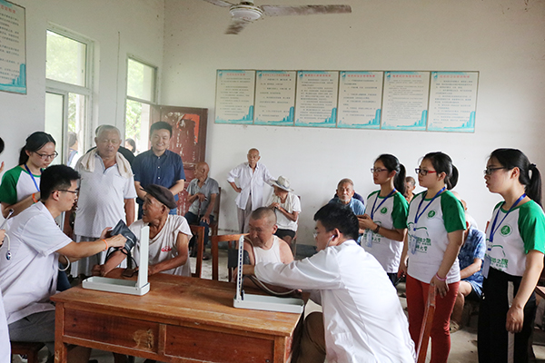 第二站:开展专家义诊及健康知识宣传活动。活动邀请了安医大一附院眼科主任医师封利霞博士、神经内科副主任医师徐仿成博士、骨科副主任医师陶晖博士及乡卫生院三位医生参加。几位专家耐心细致地为村民进行心肺听诊、血压检测、疾病咨询,就常见病、慢性病的预防措施和治疗提供了专业的医疗建议。在待诊期间,团队成员还分别为村民们进行了血糖、血压的测量,夏季常见病、高血压、预防中暑常识的宣传,健康认知状况的问卷调查工作。整个义诊活动持续到中午近一点钟,共义诊群众 180 余人次,免费测量血压 100 余人次,测血糖 100 余人次,发放宣传材料 300 余份。义诊活动得到村民们的高度赞扬,一位大爷说 “真没想到在家门口就能见到安医附院的专家,感谢你们!”