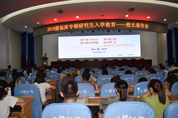 7月16日下午,学校举行2018级临床医学、口腔医学硕士专业学位研究生入学教育报告会,校长曹云霞作题为《好学力行良医梦,你我同做追梦人》的专题报告。