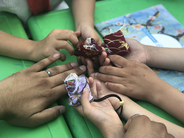 活动现场,康复中心的老师们介绍了机构的发展和参加端午节活动的儿童情况;随后,国际学生们分别加入了6个自闭症儿童家庭,陪孩子们一起看书、做游戏,在建立起信任和友谊后,他们用简单的中文和孩子们交流端午节的由来、节日风俗和中药知识。最后,在机构老师的帮助下,新组建的“国际家庭”纷纷完成了端午节草药香包的制作。