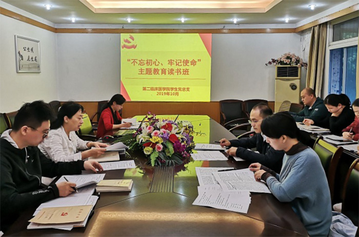 10月12日上午,第二临床医学院学生党总支开展“不忘初心、牢记使命”主题教育读书班集中学习研讨。该总支书记黄朝晖主持学习研讨,校主题教育联络组、校党政办主任赵智参会指导。