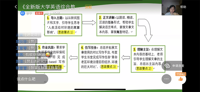 活动中,外语系教师李平结合授课单元,从“思政主题的选择与确立”“思政元素的挖掘与融入”“教学环节的设计安排”等方面,全面展示了我校大学英语“课程思政”的教学经验。据悉,此前该系教师孙娟也受邀参加活动并作了教学设计的分享。两位老师直播示范课各具特色,在语言学习的过程中巧妙融入思政元素,增加了思政内容的感染力和亲和力。两场直播课观看人数均超过千人次,获得全国英语教师同行的一致好评。