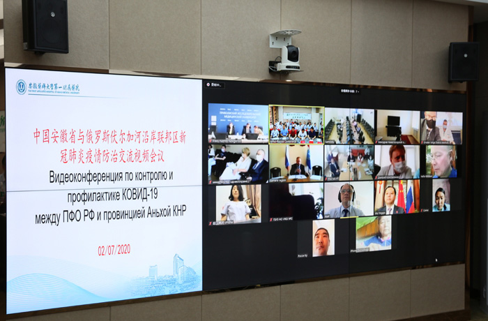 7月2日下午3时(莫斯科时间7月2日上午10时),安徽省与俄罗斯伏尔加河沿岸联邦区新冠疫情防控视频会议在第一附属医院举行。驻喀山总领事吴颖钦,省外办主任雍成瀚、省卫健委副主任杜昌智,一附院院长梁朝朝等院领导及院内多位具有抗击新冠肺炎疫情一线经验的专家,与下诺夫哥罗德州、鞑靼斯坦共和国、萨马拉州、巴什科尔托斯坦共和国、楚瓦什共和国等9个俄罗斯联邦主体50余卫生部官员和医疗专家展开远程视频交流。