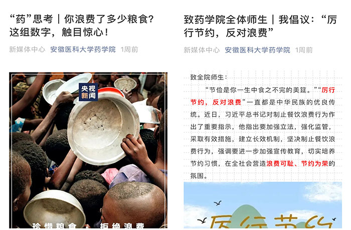 聚焦深化共识,争当崇尚节俭的宣传者。该院制定“厉行节约、反对浪费”主题教育方案,年级线上、线下方式开展“开学第一课”主题班会,楼栋寝室张贴宣传海报,党支部、团支部结合 “三会一课”、主题党日、主题团日等活动将习近平总书记关于制止餐饮浪费行为重要指示精神第一时间传达学习和贯彻落实。学院微信公众号推送倡议书《致药学院全体师生——我倡议:“厉行节约,反对浪费”》和《“药”思考——你浪费了多少粮食?这组数字,触目惊心!》,并结合“安全文明和谐友善”寝室创建,通过手抄报评比、主题签名、校园节约“金点子”征集等活动让节约意识在学子中内化于心,外化于行。