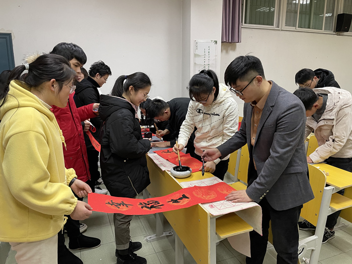 活动现场喜气洋洋、热闹非凡。师生们挥毫泼墨,书写祝福,同学们有的精心挑选,有的现场定制春联内容。一句句新年祝福表达了同学们对新年的美好期盼,对祖国的美好祝愿;一副副喜庆吉祥、散发着墨香的春联为节日增添了浓浓的欢腾气氛,同时也将优秀传统文化的魅力展现得淋漓尽致。活动中,同学们进一步感受到了中华优秀传统文化的韵味和魅力,增进了对优秀传统文化的认识和了解,同时通过“四史”知识竞答、祝福祖国等环节,进一步厚植了爱国情怀。