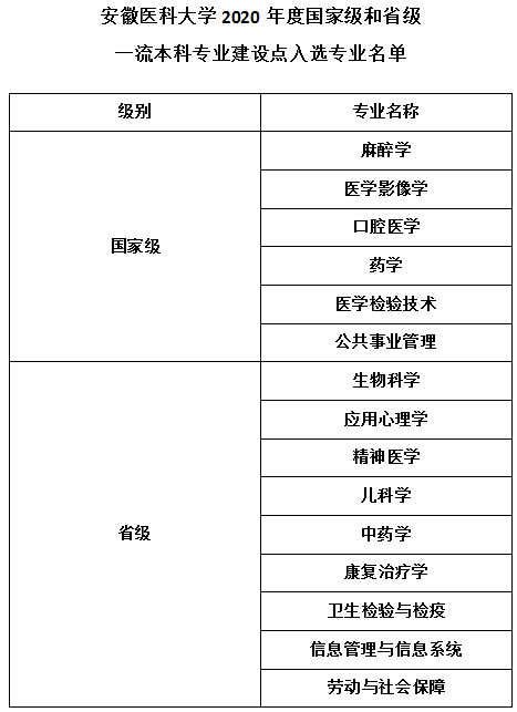 近日,教育部办公厅公布2020年度国家级和省级一流本科专业建设点名单,我校麻醉学、医学影像学、口腔医学、药学、医学检验技术、公共事业管理共6个本科专业入选国家级一流本科专业建设点,生物科学、应用心理学、精神医学、儿科学、中药学、康复治疗学、卫生检验与检疫、信息管理与信息系统、劳动与社会保障共9个本科专业入选安徽省一流专业建设点。截至目前,我校共有11个本科专业获批国家级一流本科专业建设点,11个本科专业获批省级一流本科专业建设点。