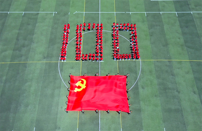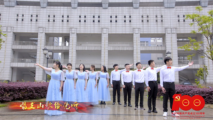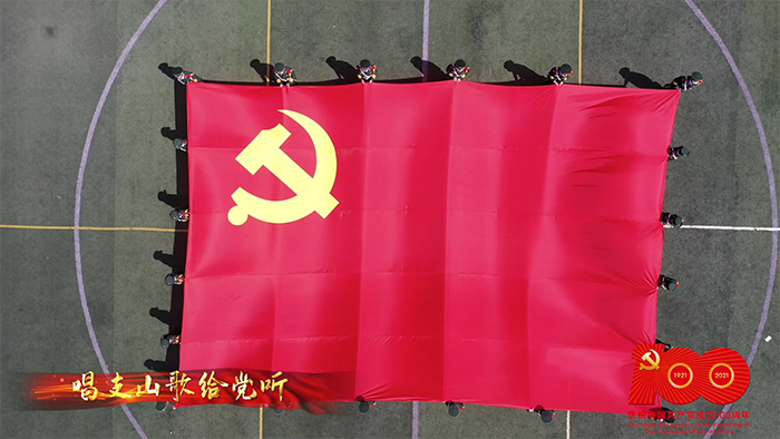 随后,视频画面跳转,伴随着缓缓展开的鲜红党旗,气势恢宏的《唱支山歌给党听》歌曲旋律与我校学子发自肺腑的歌声一同流淌出来。
