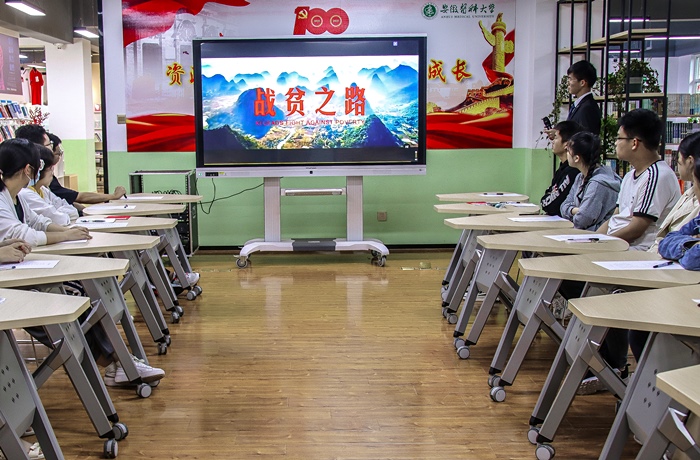 活动中,同学们先后观看了《中国共产党百年述职报》及《战贫之路》,重温了从“火种的萌芽”到“民族的新生”,从“12.8万各贫困村”到“脱贫攻坚战取得全面胜利”的全奋斗历程。新颖的资助育人形式、具有情怀与担当的视频内容增强了学生的民族自豪感和爱国热情。为传颂英雄模范,小课堂还邀请了来自第一临床医学院和药学院的学生代表讲述党史小故事。激昂的语调、真挚的情感表达了坚定理想信念、积极担当作为的强烈情感,同学们在聆听党史故事中也进一步感受到共产党人的初心使命,激发唱响青春之歌的奋斗豪情。