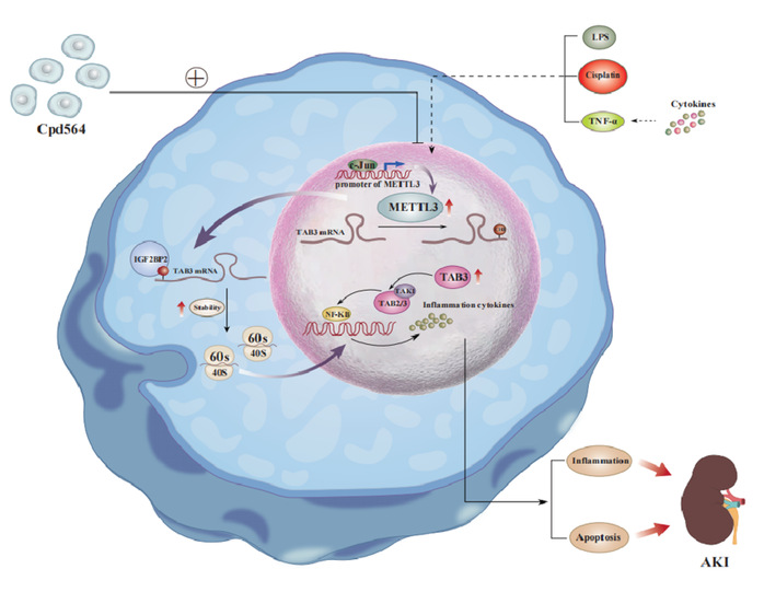 研究人员通过RNA m6A甲基化测序找到METTL3的关键靶基因TAB3,通过点突变实验验证了m6A甲基化修饰位点,并进一步发现IGF2BP2介导了METTL3对TAB3的m6A修饰并增强其稳定性,加重AKI。TAB3是一个重要的炎症调节蛋白,可与TAB2、TAK1形成复合物,参与免疫细胞NF-κB信号通路的激活,其在损伤的肾脏固有细胞中高表达但功能未明。AAV9腺相关病毒介导的TAB3在体沉默可减轻小鼠AKI损伤,而在METTL3 cKO小鼠或沉默细胞中过表达TAB3可恢复肾脏炎症和损伤,提示TAB3可能是METTL3介导AKI发生发展的关键下游。此外,研究人员从ChemDiv和MCE中虚拟筛选并验证了METTL3小分子抑制剂Cpd-564,其对缺血/再灌注或顺铂诱导的肾损伤和炎症均展示出保护作用,而在体沉默METTL3也减轻了多种诱因导致的AKI,共同提示METTL3可能是治疗AKI的潜在靶点。