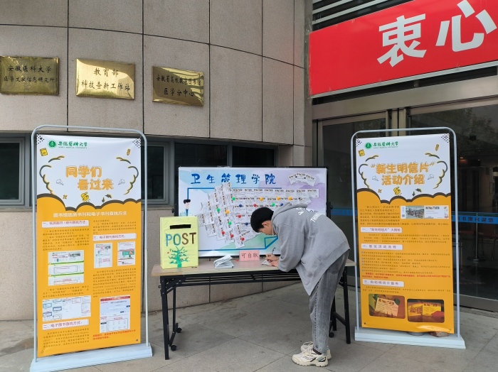 该馆近日将整理好的明信片以学院为单位分期展示在图书馆门口,并配合海报展示馆藏纸质图书和电子书刊的借阅方式,同学们可以找到自己的明信片并到相应的库室或直接通过图书馆官网的电子资源借阅心仪的书刊。目前活动已展示基础医学院、公共卫生学院、口腔医学院和卫生管理学院的新生明信片,其他学院的明信片也将分批有序展示。2022级一位新生表示:“新生明信片的活动不仅让我借到了一直想要阅读的图书,还掌握了馆藏电子图书的查阅方式,很赞!”