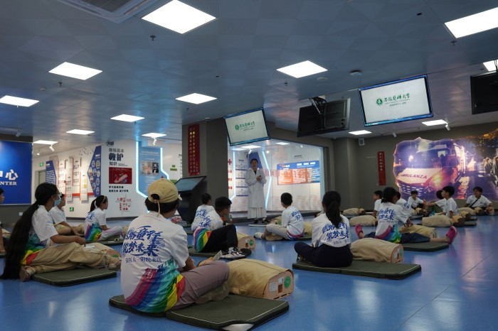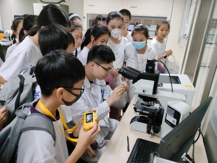 在医院,孩子们走进检验中心、临床病理中心,通过显微镜体验观察细菌,近距离观察病理科医生制作标本的过程,了解取材、脱水、包埋、切片、染色、封片等制作标本的六个步骤。在中药房和中医特色门诊区,医生为孩子们展示了不同种类、形态各异的中药饮片和道地药材,讲述传统中医故事,现场演示穴位按压、针灸,激发了他们对中医药文化的兴趣。