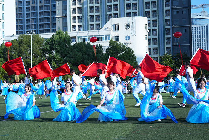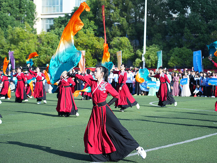 第一附属医院带来的花球啦啦操表演《我和我的祖国》,动作整齐划一、步伐轻快流畅,与飞扬的红色绸缎共同绘出祝福祖国的美丽画卷。第一临床医学院学子和药学院学子分别带来节目《舞动青春·逐梦花海》和《扇舞丹青 闪“药”芳华》,气势磅礴又行云流水,展现出青年追逐梦想、勇往直前的无限激情。