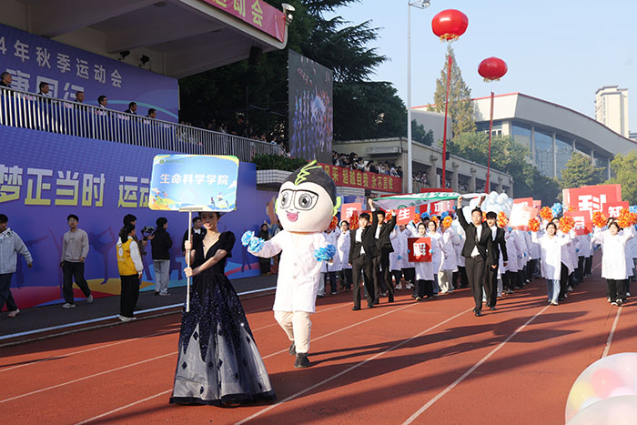 开幕式运动员入场仪式上,我校20支学生代表队和23支教工代表队迈着自信稳健的步伐依次走过主席台。青春洋溢的笑容,铿锵有力的口号,是全体运动员热情饱满的精神状态和顽强的拼搏意志的彰显。各支代表队在入场、队服、展板等方面别出心裁、大胆创新,既有独具学院特色的道具,又有活泼可爱的学院“吉祥物”,充分展现了我校师生昂扬奋进的面貌。