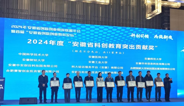 12月24日,2024年安徽省创新创业教育联盟年会暨首届“安徽省创新创业教育论坛”在合肥举行。省教育厅、人社厅相关领导出席活动,省内高校、知名企业、投资机构、科创园区等64家成员单位代表参加活动。我校获得2024年度“安徽省科创教育突出贡献奖”荣誉称号。
