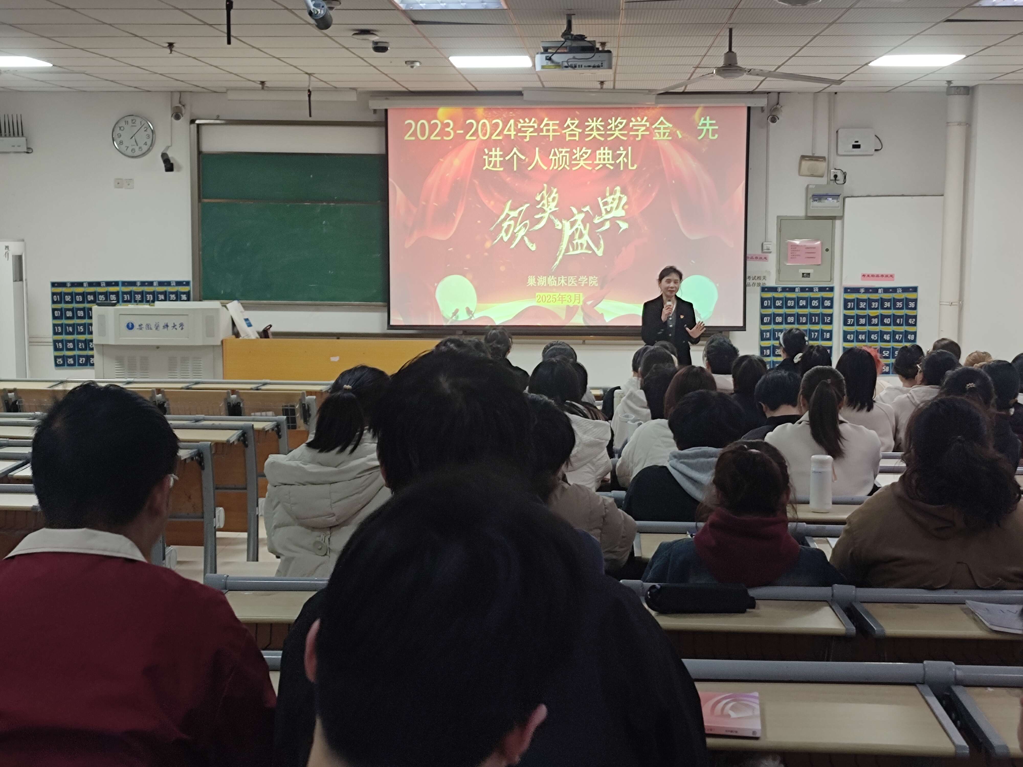 3月28日,巢湖临床医学院举行2023-2024学年各类奖学金及先进个人颁奖仪式,表彰先进典型,凝聚奋进力量,师生代表齐聚一堂,共同见证荣耀时刻。学院党委副书记余皖婉出席活动并为获奖者颁发证书。