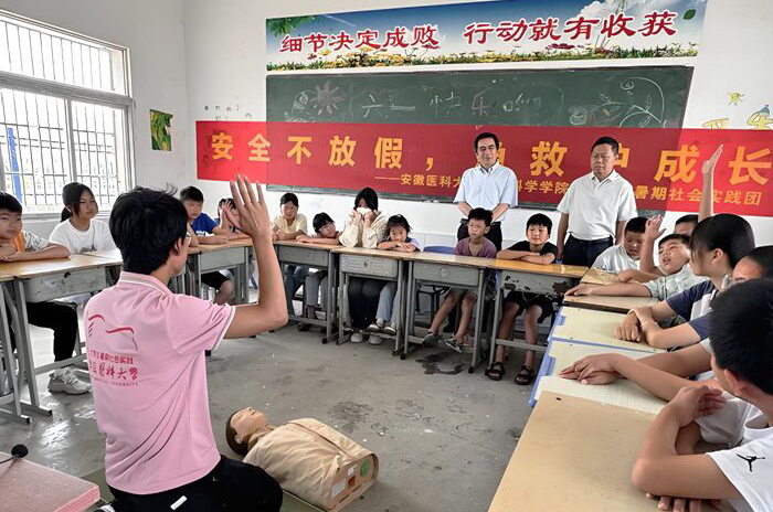 药学科学学院“蒲公英”社会实践队已连续五年深入乡村开展支教活动,先后荣获校“十佳志愿服务项目”、全国“三下乡”优秀品牌项目称号。7月9日至10日,该实践队联合第二附属医院、附属口腔医院专家,在霍邱县泽沟村开展医药知识科普、义诊、中医药文化宣传、健康体检等活动。7月11日至13日,队伍“转战”黄泊渡村,开展普通话推广调研及支教活动,受到当地群众广泛欢迎与好评。